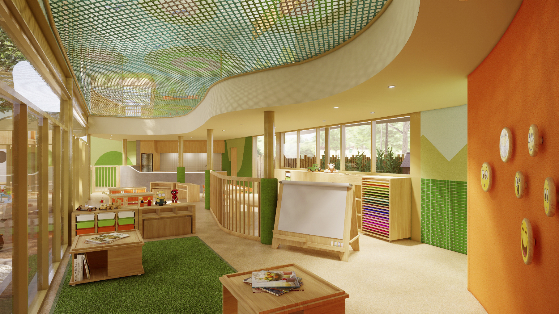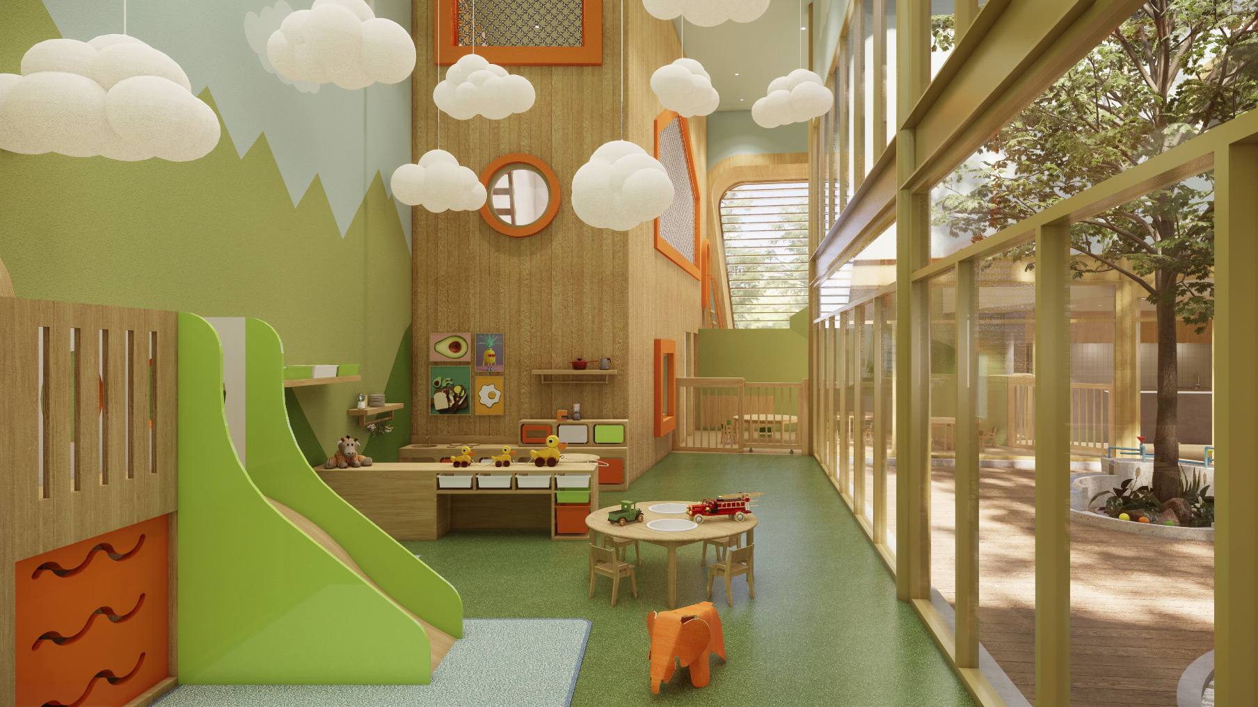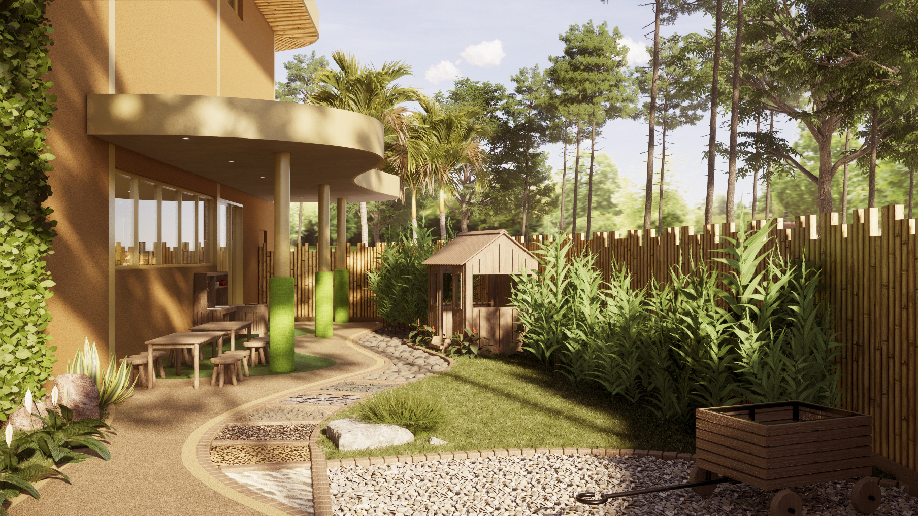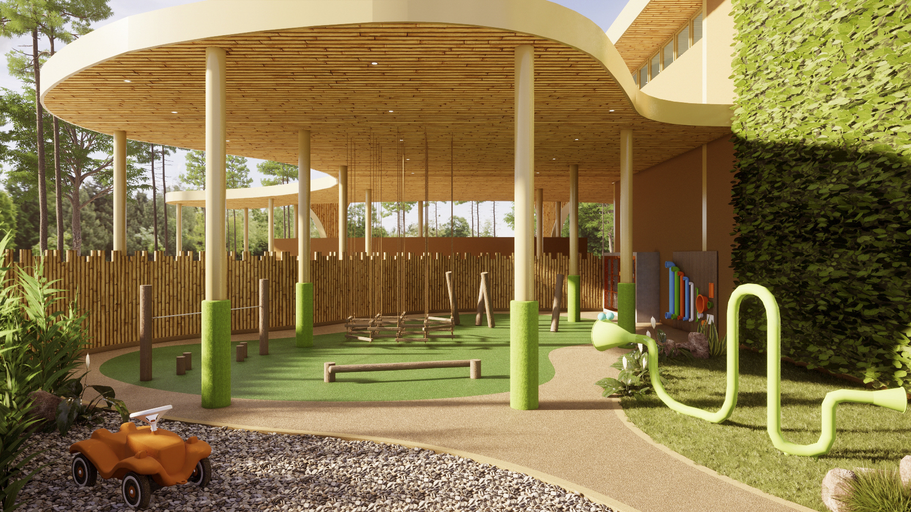 The outdoor garden and covered playground are key features in a dynamic scenario. It allows the children to be closer to the environment and encourages them to have more interaction with nature. This idea is achieved by creating a playful space of exploration, experimentation and discovery, to help develop different skills such as climbing, jumping, balancing, and creating.