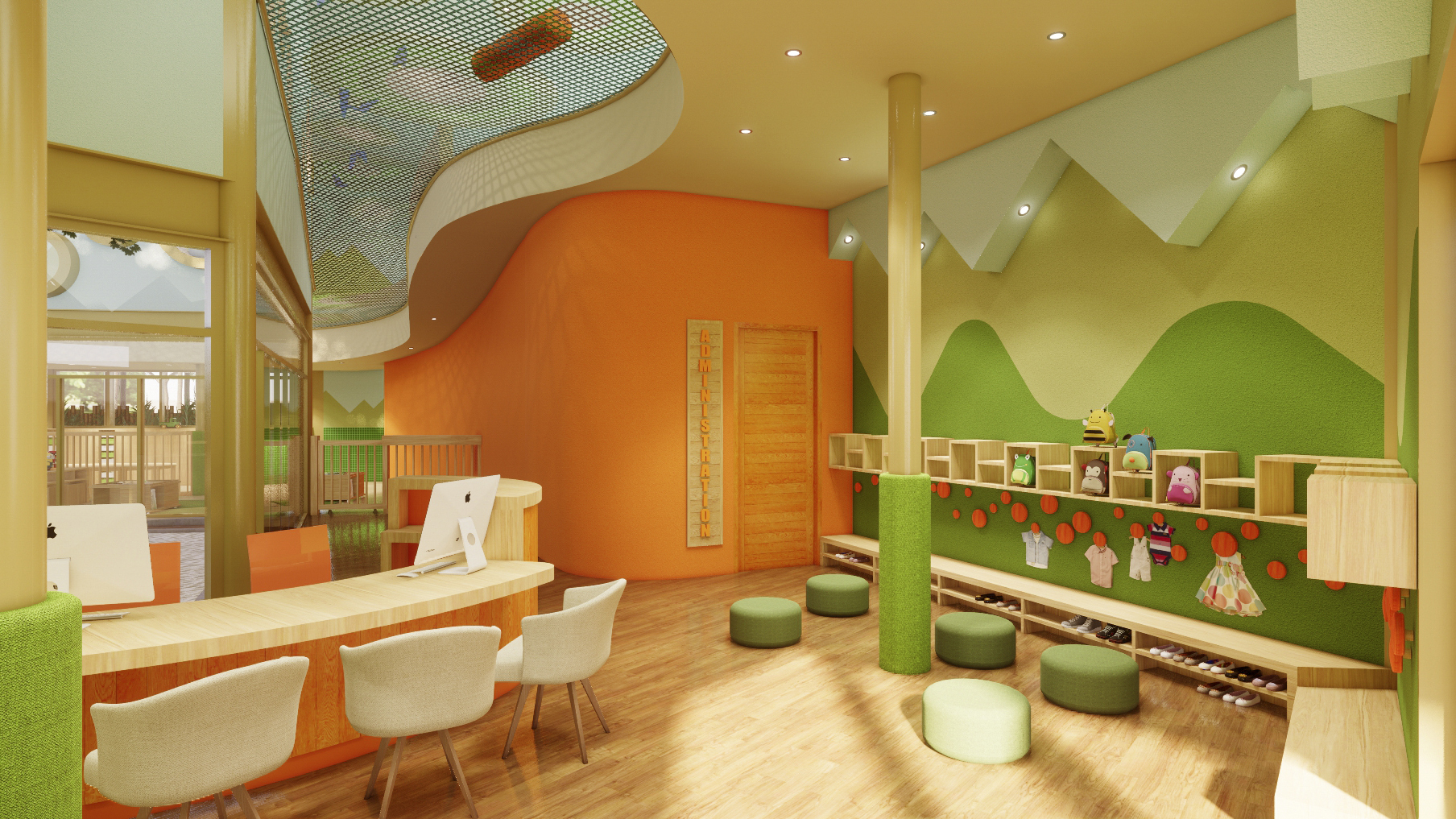 By the entrance, a curved front desk in the vestibule will welcome our small guests and their parents. The reception features custom furniture for children, such as a bench which doubles as a shoe rack, shelves and hooks at kids height for their storage.