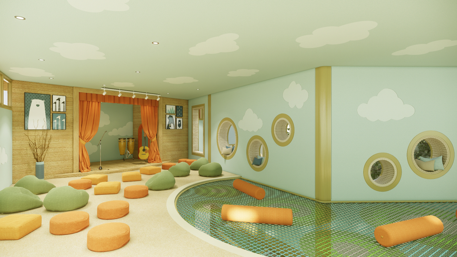To complement the physical development, some other features support the intellectual and artistic stimulation: a small scale amphitheater fitted with cushion mattress for watching movies and relaxing, a stage for performances, a reading area, an arts and crafts zone, and a cooking station.